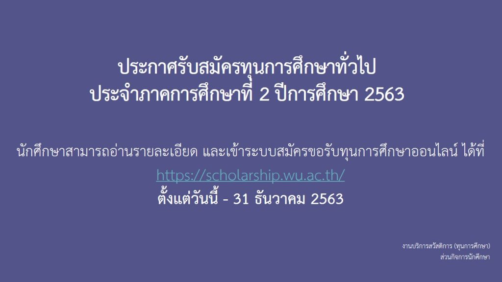 นักศึกษาสามารถอ่านรายละเอียดและเข้าระบบสมัครขอรับทุนการศึกษาออนไลน์ได้ที่ https://scholarship.wu.ac.th ตั้งแต่วันนี้ – 31 ธันวาคม 2563