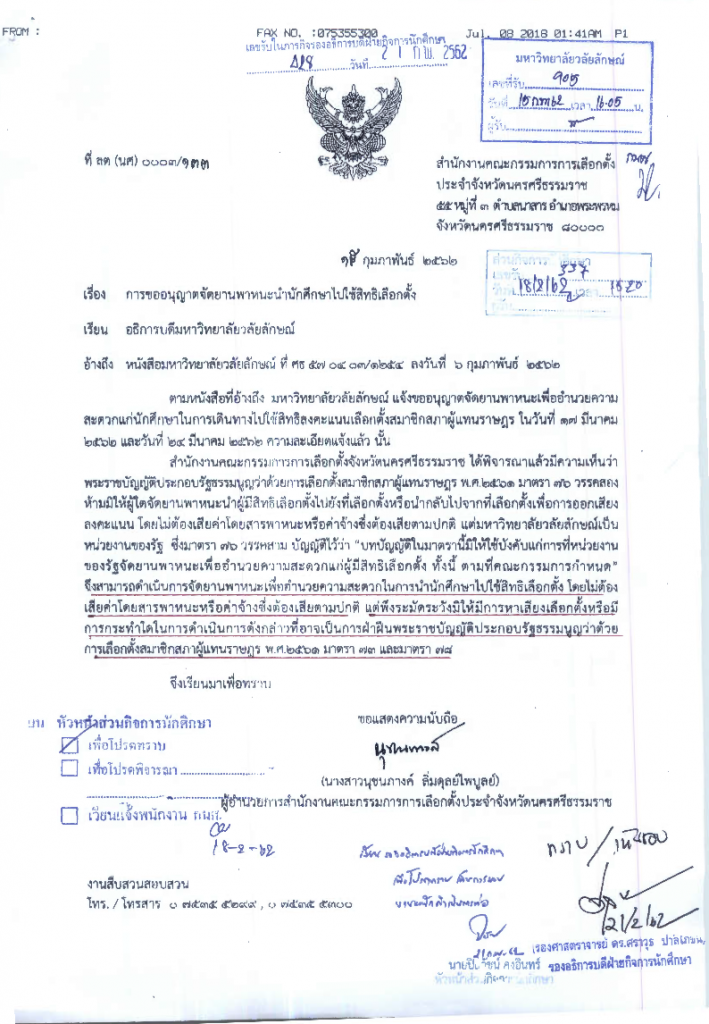 ตามที่ คณะกรรมการการเลือกตั้งประจำจังหวัดนครศรีธรรมราช อนุญาตให้มหาวิทยาลัยวลัยลักษณ์จัดยานพาหนะนำนักศึกษาไปใช้สิทธิเลือกตั้งในวันที่ 24 มีนาคม 2562 ได้ ตามหนังสือที่ ลต(นศ) ๐๐๓/๑๓๓ ลงวันที่ 15 กุมภาพันธ์ 2562