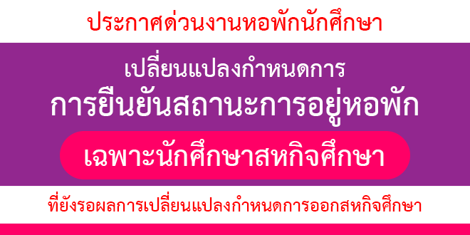 ตามประกาศการลาออกจากหอพักภาคเรียนที่ 3/2563 กำหนดให้นักศึกษาหอพักปัจจุบัน ที่ไม่ประสงค์จะอยู่หอพักต่อในภาคเรียนที่ 3/2563 ดำเนินการยื่นเอกสารการลาออก ในวันที่ 4-8 มกราคม 2564 ต่อที่ปรึกษาหอพักนั้น ด้วยกำหนดการออกสหกิจศึกษามีการเปลี่ยนแปลง จึงขอเปลี่ยนแปลงกำหนดการลาออกจากหอพักของนักศึกษาออกสหกิจศึกษาที่ไม่ประสงค์อยู่หอพักในภาคการศึกษาที่ 3/2563 ขยายเวลาให้ดำเนินการส่งเอกสารลาออกจากหอพักจนถึง 25 มกราคม 2564 ตามรายละเอียด ดังนี้