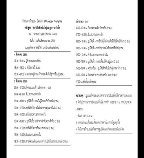 ชมรม WU Love Care และงานบริการและสวัสดิการ ส่วนกิจการนักศึกษา เชิญชวนน้องปี 1 เข้าร่วมการอบรมเพื่อพัฒนาตนเอง หลักสูตร 7 อุปนิสัยสำหรับวัยรุ่นมุ่งสู่ความสำเร็จ