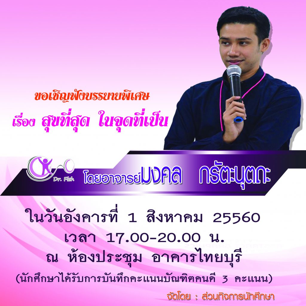 ขอเชิญนักศึกษาและผู้ที่สนใจเข้าร่วมฟังบรรยายพิเศษ เรื่อง "สุขที่สุด ในจุดที่เป็น" โดยอาจารย์มงคล กรัตะนุตถะ หรือ Dr.Fish นักเขียนและวิทยากรมากประสบการณ์ ในวันอังคารที่ 1 สิงหาคม 2556 เวลา 17.00-20.00 น. ณ ห้องประชุม อาคารไทยบุรี (นักศึกษาได้รับการบันทึกคะแนนบัณฑิตคนดีจำนวน 3 คะแนน)