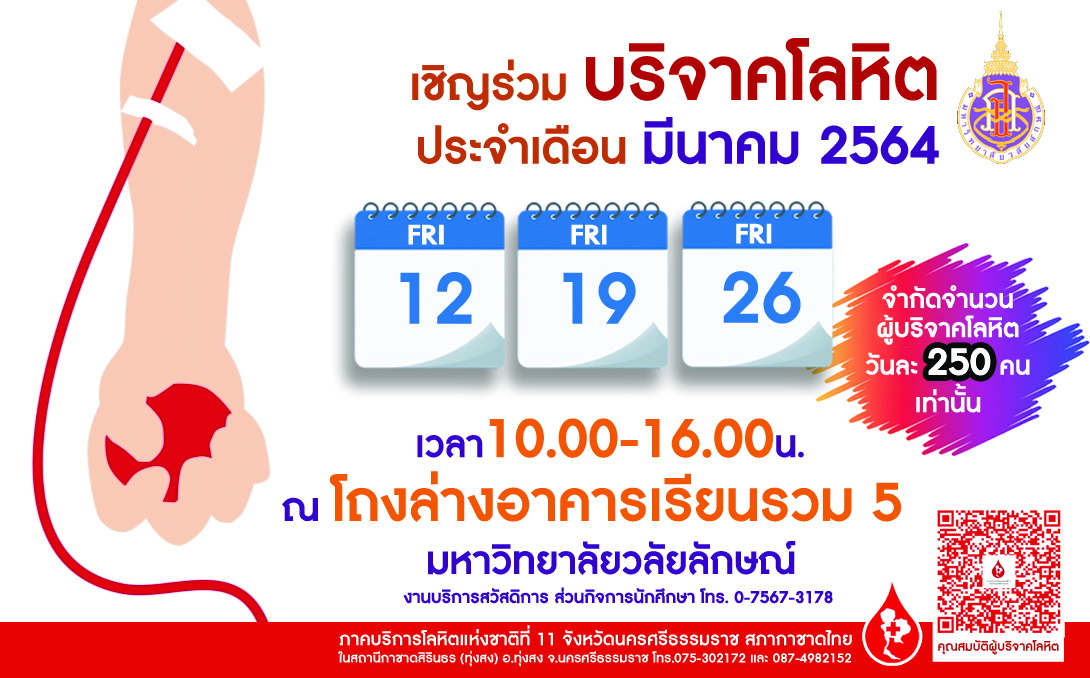 มหาวิทยาลัยวลัยลักษณ์ร่วมกับภาคบริการโลหิตแห่งชาติที่ 11 จังหวัดนครศรีธรรมราช ขอเชิญทุกท่านร่วมบริจาคโลหิตเพื่อช่วยเหลือเพื่อนมนุษย์ ในวันศุกร์ที่ 12, 19, 26 มีนาคม 2564 เวลา 10.00-16.00 น. ณ โถงล่างอาคารเรียนรวม 5 มหาวิทยาลัยวลัยลักษณ์