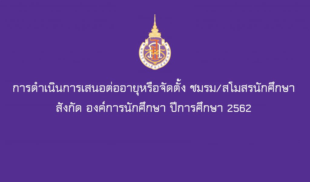 1. สามารถยื่นเอกสารการต่ออายุชมรม / สโมสรนักศึกษา หรือ การจัดตั้งชมรม สโมสรนักศึกษา ใหม่ ที่ งานส่งเสริมกิจกรรมนักศึกษา สำนักงานส่วนกิจการนักศึกษา ชั้น 2 อาคารไทยบุรี ภายในวันที่ 17 พฤษภาคม 2562 ในวัน เวลา ราชการ รายละเอียดเพิ่มเติม ติดต่อ นายมณเฑียร สุขกุล เจ้าหน้าที่บริหารงานทั่วไป งานส่งเสริมกิจกรรมนักศึกษาเบอร์โทรภายใน 3164 เบอร์โทรศัพท์มือถือ / Line 063 -5916454