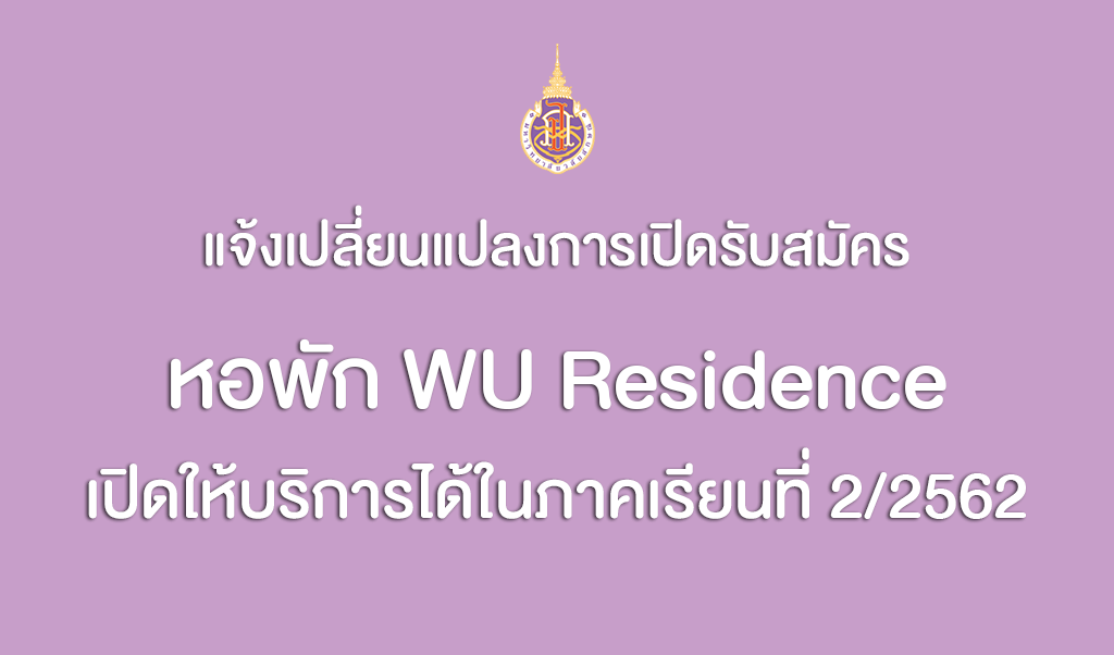 ขอเปลี่ยนแปลงการเปิดรับสมัครหอพัก WU Residence จากเดือนกรกฎาคม 2562 เป็นเดือนตุลาคม 2562 เป็นต้นไป