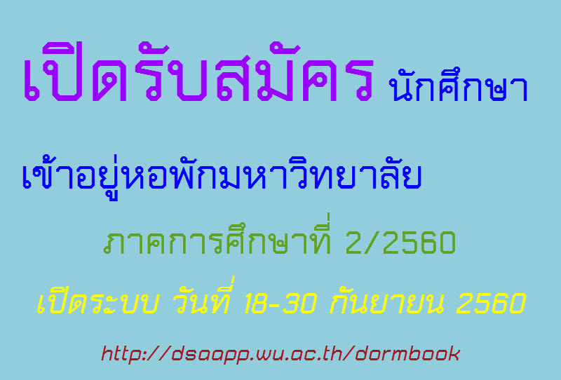 1. เข้าไปสมัครหอพักได้ที่ http://dsaapp.wu.ac.th/dormbook/login.asp โดยระบุหอพักที่ต้องการ และหอพักสำรอง ไม่ต้องระบุห้องพัก ระหว่างวันที่ 18-30 กันยายน 2560 เปิดระบบตั้งแต่เวลา 10.00 น.เป็นต้นไป โดยใช้ User Name และ Password ของศูนย์บริการการศึกษา