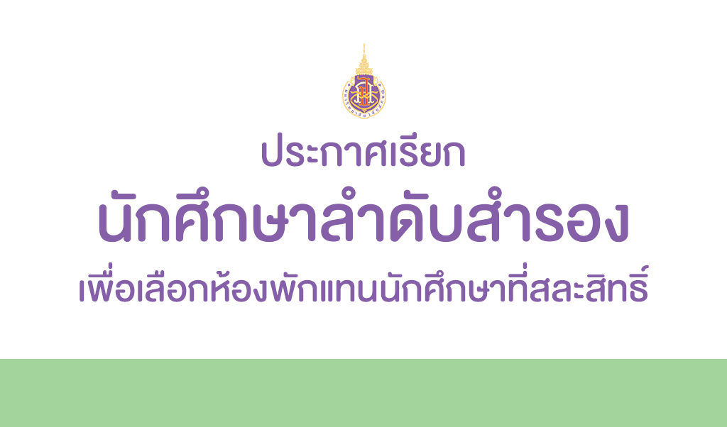 ตามที่งานหอพักได้ประกาศรายชื่อนักศึกษาลำดับสำรองไว้ในกรณีที่หอพักมีที่ว่างจากการสละสิทธิ์ ในการนี้จึงขอประกาศเรียกนักศึกษาเพื่อให้มาดำเนินการเลือกห้องพักและชำระค่าธรรมเนียมหอพักฯ ตามกำหนดการที่ได้แจ้งไว้ก่อนหน้านี้