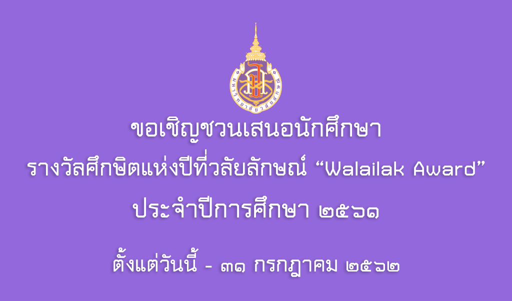 ในการนี้ จึงขอเชิญชวนคณาจารย์ บุคลากร และนักศึกษา เสนอชื่อนักศึกษาที่สมควรได้รับรางวัลศึกษิตแห่งปีที่วลัยลักษณ์ “Walailak Award” ประจำปีการศึกษา 2561 รายละเอียดตามไฟล์ใบเสนอชื่อที่แนบมากับข่าวนี้ โดยสามารถเสนอชื่อภายในวันที่ 31 กรกฎาคม 2562 ส่งมายัง งานส่งเสริมกิจกรรมนักศึกษา ส่วนกิจการนักศึกษา อาคารไทยบุรี