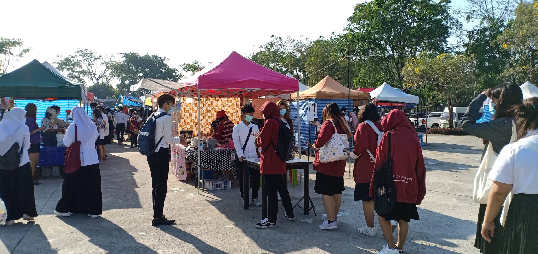 วันที่ 22 กุมภาพันธ์ 2564 งานส่งเสริมกิจกรรมนักศึกษา ส่วนกิจการนักศึกษา นำโดย คุณกอบสุข อรชร หัวหน้างานส่งเสริมกิจกรรมนักศึกษา นักศึกษาองค์การบริหารองค์การนักศึกษา นักศึกษาจิตอาสาช่วยตรวจคัดกรอง รวมถึงเจ้าหน้าที่งานส่งเสริมกิจกรรมนักศึกษาทุกท่าน ลงพื้นที่คุมเข้มเพื่อบังคับใช้มาตรการควบคุมโรค COVID-19 100% ที่ตลาดจันทร์ประดู่เพื่อกำกับดูแลตลาดจันทร์ประดู่ให้เป็นไปตามประกาศ เรื่อง มาตรการควบคุมโรคสำหรับตลาดถนนคนเดินหรือตลาดเฉพาะกิจในที่สาธารณะ ตลาดนัด โดยกำกับมีมาตรการคัดกรอง วัดอุณหภูมิ และประชาสัมพันธ์ กำกับให้สวมหน้ากากอนามัย และมีการวัดอุณหภูมิ ลงทะเบียน บริการแอลกอฮอร์เจล แก่นักศึกษาและบุคคลที่มาใช้บริการ หรือจับจ่ายสินค้าที่ตลาดจันทร์ประดู่ ซึ่งผู้ประกอบการทุกคนให้ความร่วมมือกับมาตรการดังกล่าวเป็นอย่างดีจึงให้มั่นใจว่าผู้เข้ามาใช้บริการในตลาดจันทร์ประดู่จะมีความปลอดภัยอย่างสูงสุด ปราศจากโรค COVID-19