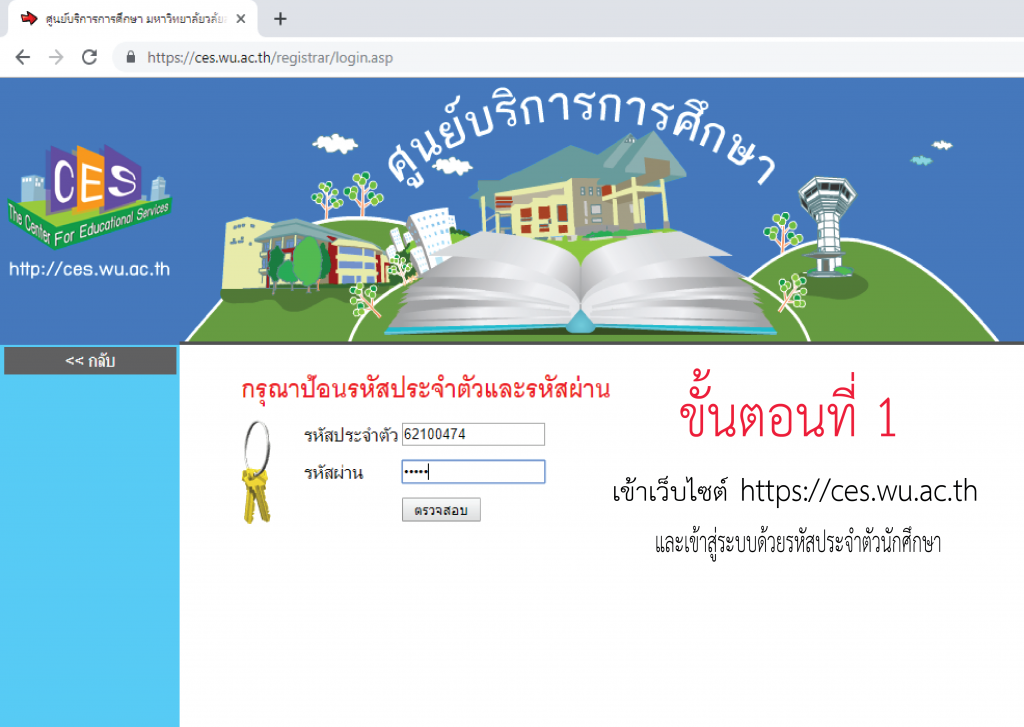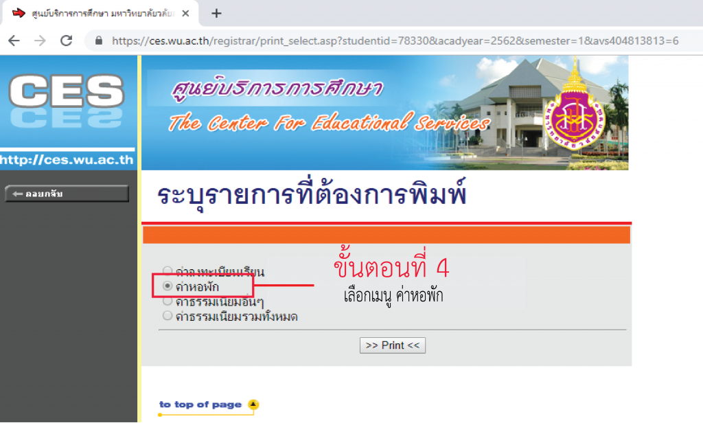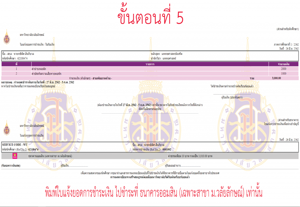 ตามที่มีนักศึกษาชั้นปีที่ 1 ที่รายงานตัวเข้าอยู่หอพัก โดยยังไม่ได้ชำระเงินค่าธรรมเนียมหอพักและค่าประกันความเสียหายหอพักให้เรียบร้อย งานหอพักนักศึกษาจึงขอแจ้งให้นักศึกษาดำเนินการชำระเงินดังกล่าว โดยพิมพ์ใบชำระเงินและนำไปชำระที่ธนาคารออมสิน สาขามหาวิทยาลัยวลัยลักษณ์ (อาคารไทยบุรี) โดยดำเนินการตามขั้นตอนดังนี้