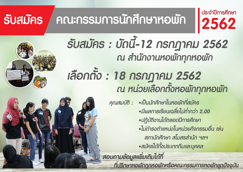 ด้วยคณะกรรมการนักศึกษาประจำหอพัก ประจำปีการศึกษา 2561 ได้ดำรงตำแหน่งครบวาระแล้ว เพื่อให้การรับสมัครคณะกรรมการนักศึกษาหอพัก ประจําปีการศึกษา 2562 เป็นไปด้วยความเรียบร้อย งานหอพักขอกําหนดรายละเอียดในการเลือกตั้งคณะกรรมการนักศึกษาหอพักปีการศึกษา 2562 ดังต่อไปนี้