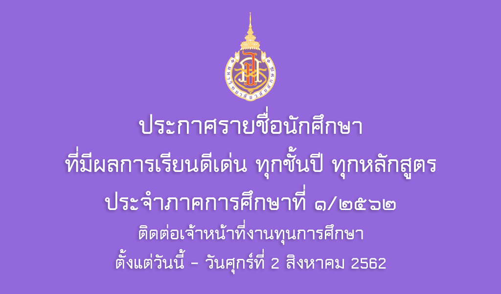 งานบริการสวัสดิการ (ทุนการศึกษา) ส่วนกิจการนักศึกษาขอประกาศรายชื่อนักศึกษาที่มีผลการเรียนดีเด่น ประจำภาคการศึกษาที่ 1/2562 (ทุกชั้นปี ทุกหลักสูตร) รายละเอียดตามไฟล์เอกสารแนบท้าย