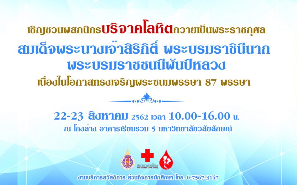 มหาวิทยาลัยวลัยลักษณ์ร่วมกับภาคบริการโลหิตแห่งชาติที่ 11 จังหวัดนครศรีธรรมราช ขอเชิญทุกท่านร่วมบริจาคโลหิตเพื่อถวายเป็นพระราชกุศล สมเด็จพระนางเจ้าสิริกิติ์ พระบรมราชินีนาถ พระบรมราชชนนี พันปีหลวง เนื่องในโอกาสทรงเจริญพระชนมพรรษา 87 พรรษา ในวันพฤหัสบดีที่ 22 และวันศุกร์ที่ 23 สิงหาคม 2562 เวลา 10.00-16.00 น. ณ โถงล่างอาคารเรียนรวม 5 มหาวิทยาลัยวลัยลักษณ์