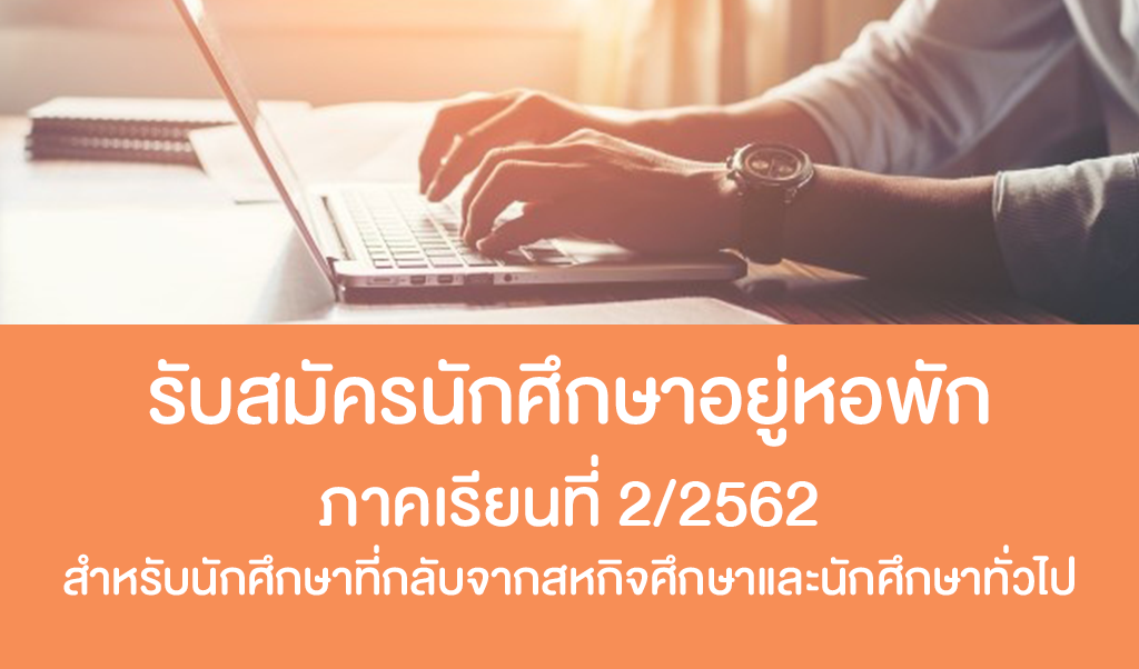 งานหอพักเปิดรับสมัครนักศึกษาอยู่หอพัก สำหรับนักศึกษาที่กลับจากสหกิจศึกษาในภาคเรียนที่ 1/2562 และนักศึกษาทั่วไปที่ประสงค์จะพักในหอพักของมหาวิทยาลัยในภาคเรียนที่ 2/2562 โดยให้นักศึกษาดำเนินการดังนี้