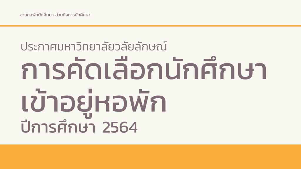 เรื่อง การคัดเลือกนักศึกษาเข้าอยู่หอพักนักศึกษา ประจำปีการศึกษา 2564