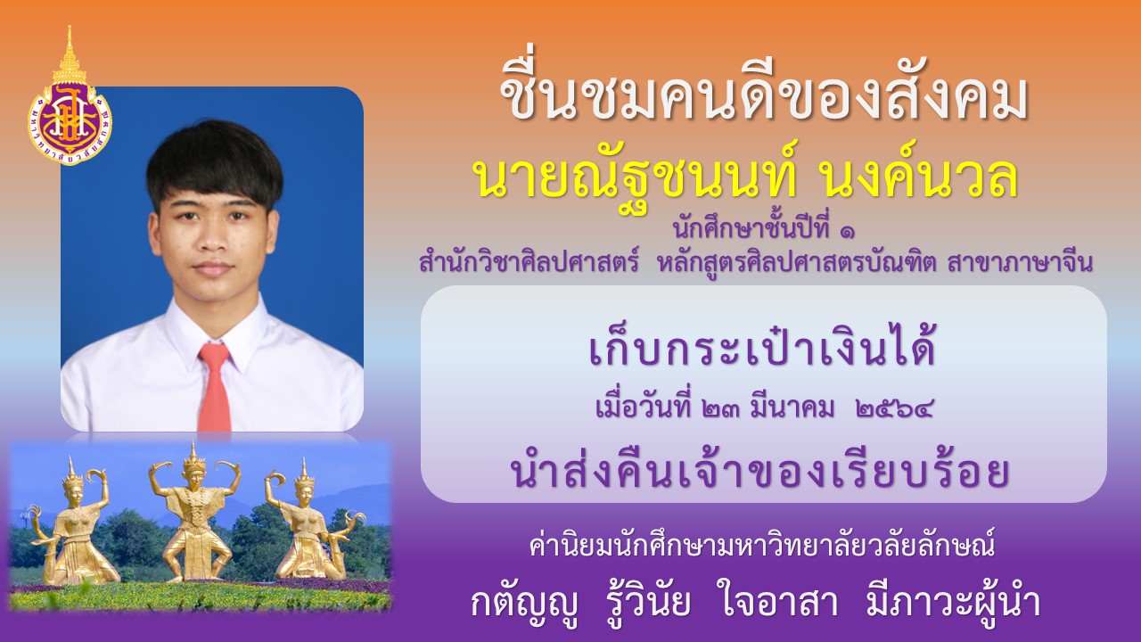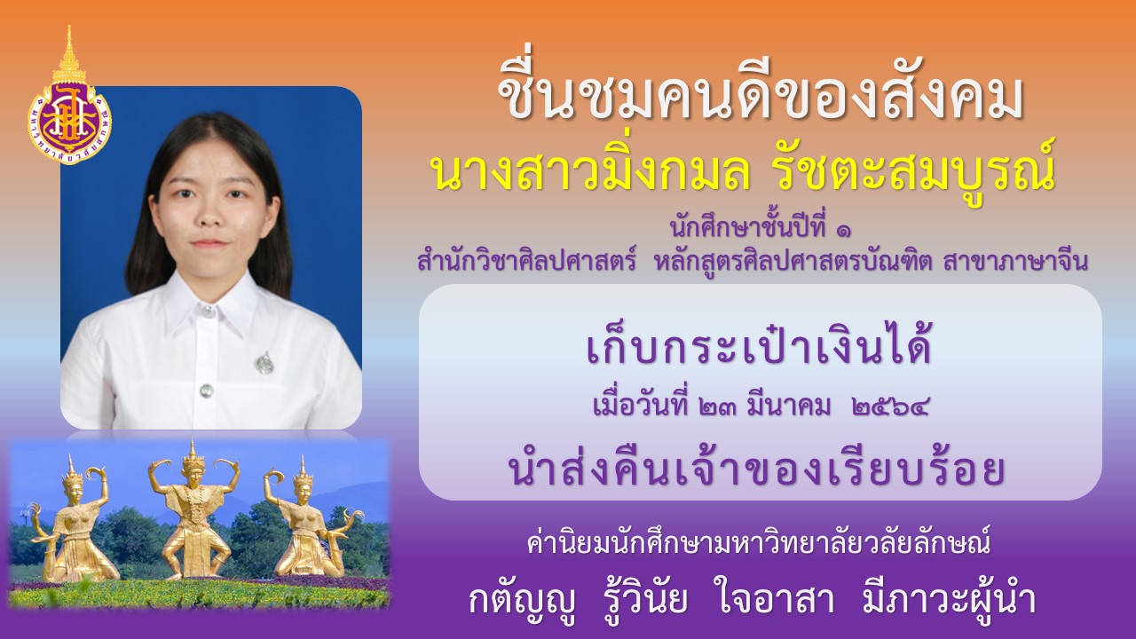 เมื่อวันที่ 23 มีนาคม 2564 นางสาวมิ่งกมล รัชตะสมบูรณ์ และ นายณัฐชนนท์ นงค์นวล นักศึกษาชั้นปีที่ 1 สำนักวิชาศิลปศาสตร์ หลักสูตรศิลปศาสตรบัณฑิต สาขาภาษาจีน เก็บกระเป๋าเงินได้แล้วนำมาแจ้งเพื่อติดตามหาเจ้าของ ซึ่งส่วนกิจการนักศึกษาได้ติดต่อเจ้าของกระเป๋าเงินเรียบร้อยแล้ว