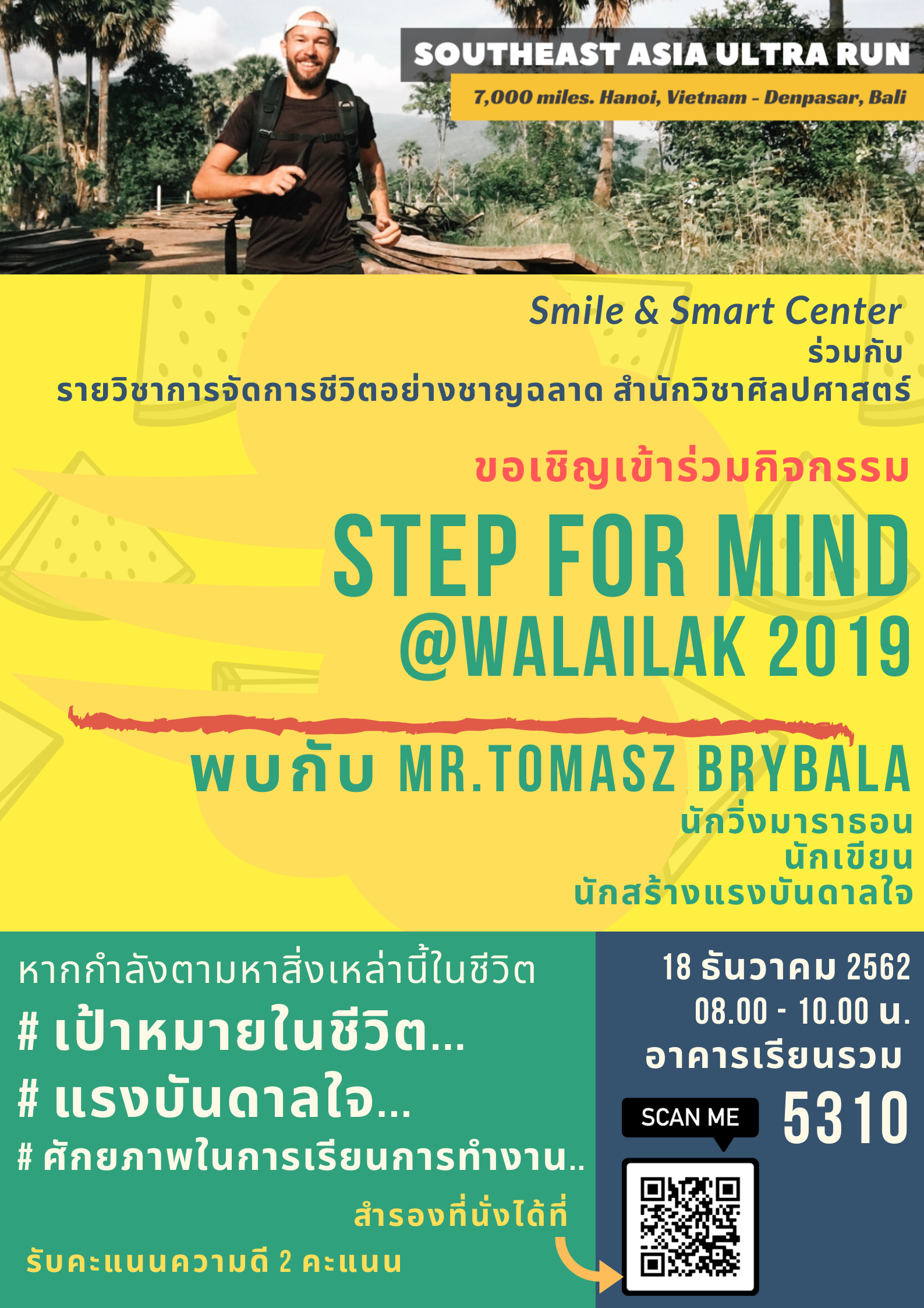 ศูนย์ Smile & Smart Center ส่วนกิจการนักศึกษา และสำนักวิชาศิลปศาสตร์ ขอเชิญชวนนักศึกษาและผู้สนใจเข้าร่วมฟังบรรยายพิเศษ เรื่อง “Step for mind @WALAILAK 2019” พบกับ Mr.Tomasz Brybala นักวิ่งมาราธอน นักเขียน นักพูดสร้างแรงบันดาลใจ ซึ่งมีภารกิจที่ท้าทายเพื่อพบเยาวชนในเอเซียตะวันออกเฉียงใต้ให้ได้ 100,000 คน ในวันที่ 18 ธันวาคม 2562 เวลา 08.00-10.00 น. ณ อาคารเรียนรวม 5310 สอบถามเพิ่มเติมได้ที่ โทร. 3122, 3147