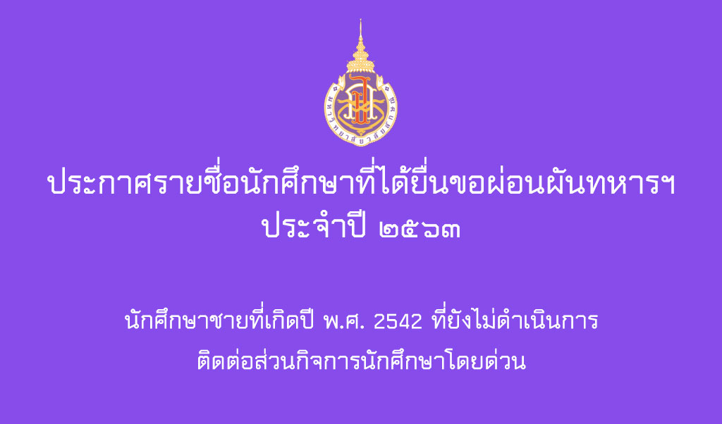 ตามที่ส่วนกิจการนักศึกษา ได้อำนวยความสะดวกแก่นักศึกษาชายที่เกิดในปี พ.ศ. 2542 (อายุ 21 ปี) ในการส่งเอกสารขอผ่อนผันฯ ประจำปี 2563 ไปยังจังหวัดทหารของนักศึกษา โดยขณะนี้มีนักศึกษามาดำเนินการยื่นความประสงค์ขอผ่อนผันแล้ว 198 คน โดยนักศึกษาสามารถตรวจสอบรายชื่อได้ตามไฟล์แนบ