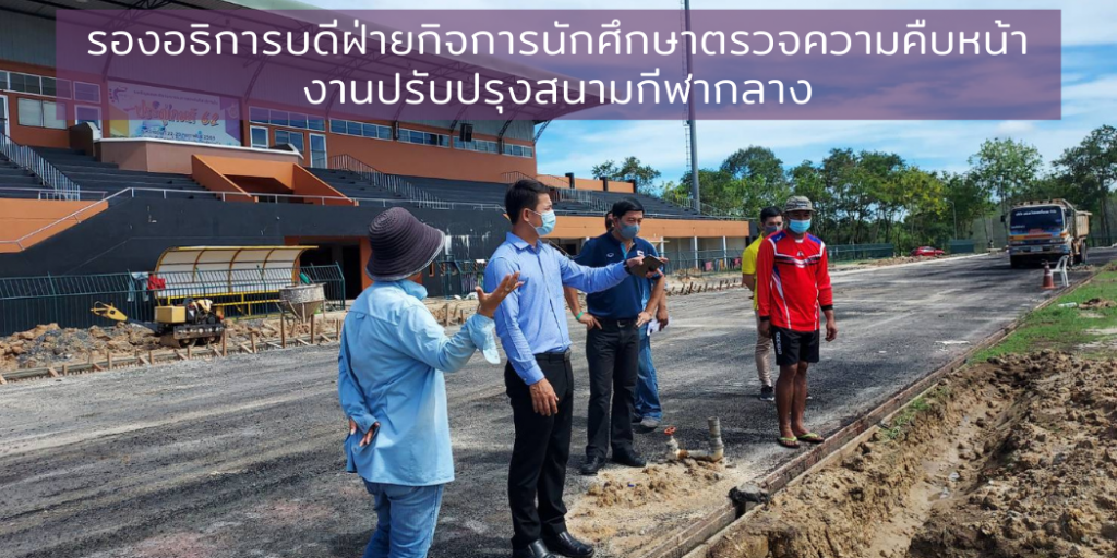 รองศาสตราจารย์ ดร.ศราวุธ ปาลิโภชน์ รองอธิการบดีฝ่ายกิจการนักศึกษา พร้อมด้วยอาจารย์นรากร สุวรรณโชติ ผู้ช่วยอธิการบดีฝ่ายส่งเสริมกีฬา ได้ไปตรวจความคืบหน้างานปรับปรุงสนามกีฬากลาง โดยเร่งรัดให้ผู้รับจ้างดำเนินการตามแผนงาน เพื่อให้แล้วเสร็จตามกำหนด