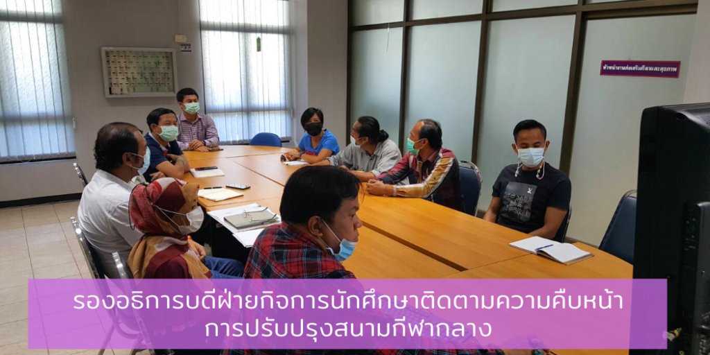 วันที่ 17 พ.ค. 2564 เวลา 09.00 – 10.00 น. รองศาสตราจารย์ ดร.ศราวุธ ปาลิโภชน์ รองอธิการบดีฝ่ายกิจการนักศึกษา อาจารย์นรากร สุวรรณโชติ ผู้ช่วยอธิการบดีฝ่ายส่งเสริมกีฬา พร้อมด้วย นายปิยวัชน์ คงอินทร์ หัวหน้าส่วนกิจการนักศึกษา ได้ประชุมร่วมกับผู้รับเหมาและกรรมการควบคุมงาน ตรวจความคืบหน้างานปรับปรุงสนามกีฬากลาง และงานก่อสร้างสนามฟุตซอล ทั้งนี้เพื่อเร่งรัดและแก้ปัญหาต่างๆ ให้ผู้รับเหมาสามารถดำเนินการตามแผนงานให้แล้วเสร็จตามกำหนดสัญญา