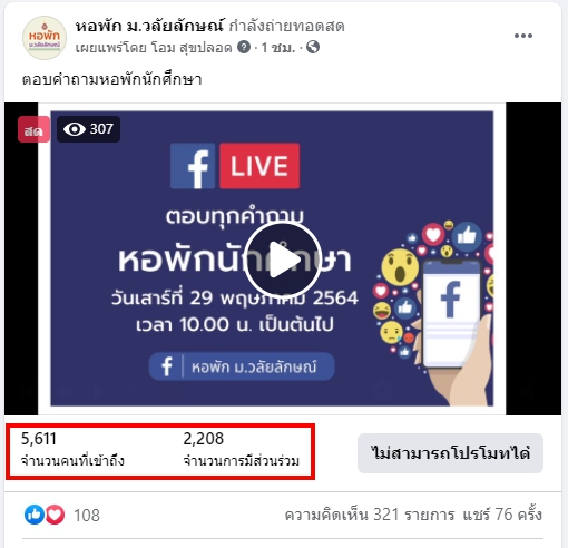 และเมื่อวันที่ 29 พฤษภาคม 2564 งานหอพักนักศึกษา LIVE ผ่านช่องทาง Facebook เพื่อให้ข้อมูลด้านหอพักนักศึกษาอีกครั้ง มีนักศึกษาและผู้ปกครองสนใจเข้าร่วมรับฟังกว่า 5,600 คน