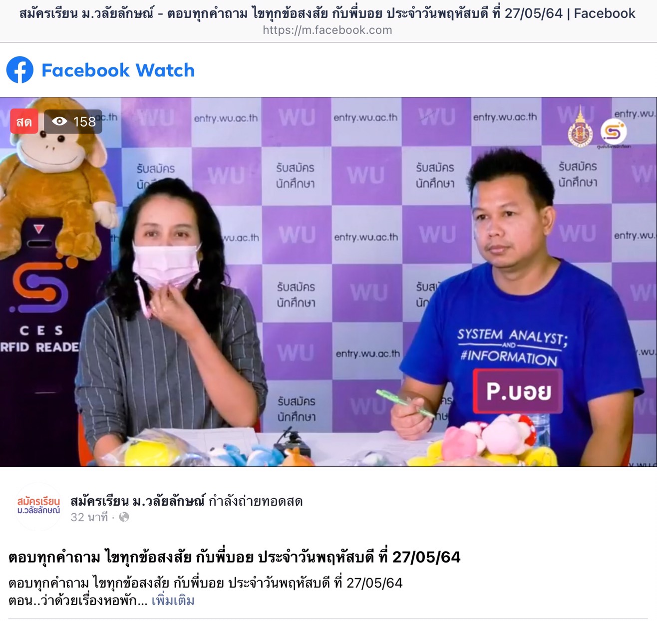 เมื่อวันที่ 27 พฤษภาคม 2564 ที่ปรึกษาหอพัก ส่วนกิจการนักศึกษา ร่วมกับศูนย์บริการการศึกษาเปิดช่วง LIVE ผ่านช่องทาง Facebook เพื่อให้ข้อมูลด้านหอพักแก่นักศึกษาและผู้ปกครอง https://www.facebook.com/watch/live/?v=221787379471872&ref=watch_permalink