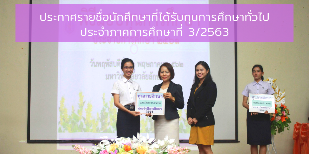 จึงขอประกาศรายชื่อนักศึกษาที่ได้รับการพิจารณาให้ได้รับทุนการศึกษาทั่วไป ประจำภาคการศึกษาที่ 3/2563 โดยกดที่เมนู ประกาศผล ในเว็บไซต์ https://scholarship.wu.ac.th หรือ กดดูรายชื่อตามลิงก์ที่แนบมาในประกาศนี้