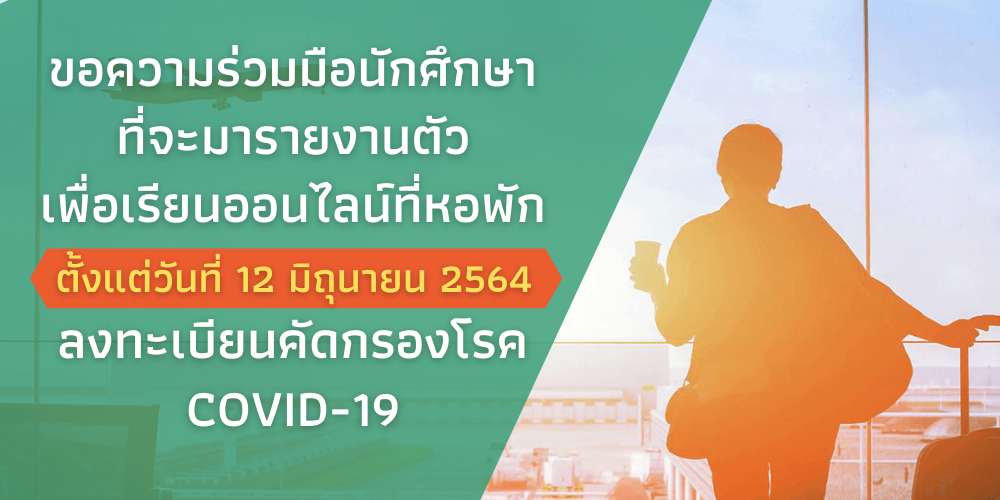นักศึกษาที่มีความจำเป็นและแจ้งความประสงค์จะเดินทางมารายงานตัวเพื่อเรียนออนไลน์ที่หอพักในตั้งแต่วันที่ 12 มิถุนายน 2564 เป็นต้นไป เนื่องจากยังมีสถานการณ์การแพร่ระบาดของโรคติดเชื้อไวรัสโคโรน่า 2019 (COVID-19) มหาวิทยาลัยมีความห่วงใยสุขภาพของนักศึกษา ดังนั้น เพื่อป้องกันการแพร่ระบาดของโรค จึงขอความร่วมมือนักศึกษาใหมทุกคนที่จะเดินทางมาหอพักของมหาวิทยาลัย โปรดตอบแบบสอบถามคัดกรองโรคติดเชื้อไวรัสโคโรน่า 2019 (COVID-19) ตามความเป็นจริง