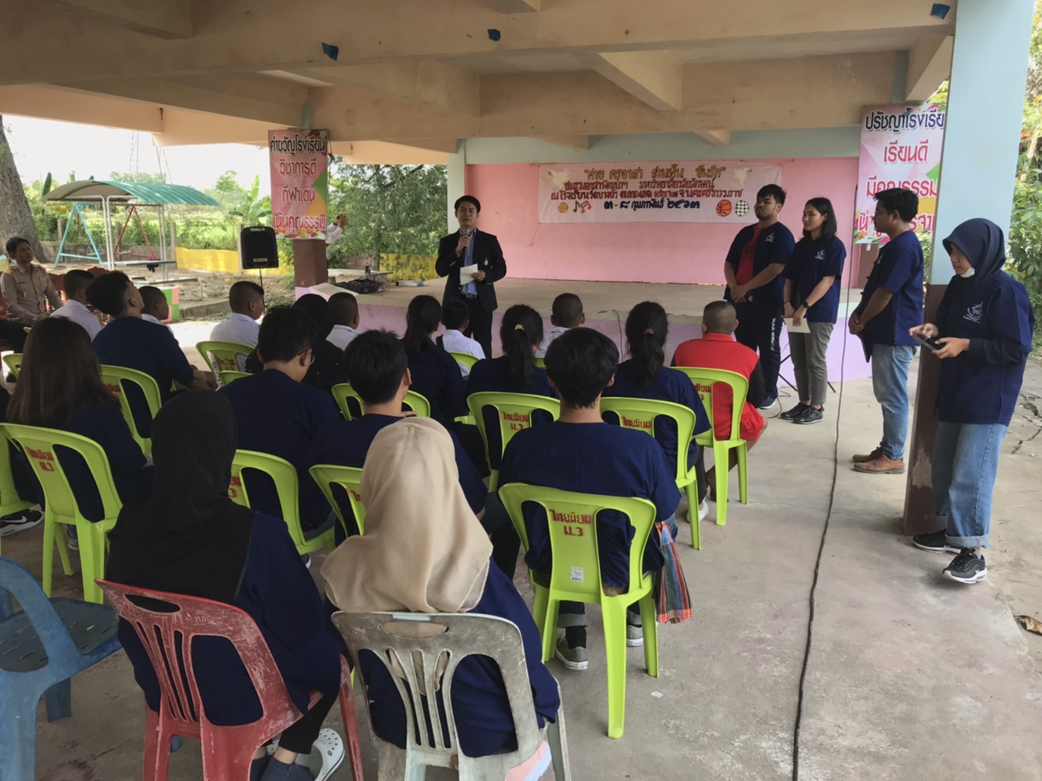 โดยรองอธิการบดีฝ่ายกิจการนักศึกษา กล่าวชื่นชมนักศึกษาที่มีจิตอาสามาทำประโยชน์ให้กับโรงเรียนและชุมชน พร้อมทั้งกล่าวขอบคุณในความร่วมมือและสนับสนุนของผู้อำนวยการโรงเรียนและคณะกรรมการสถานศึกษาโรงเรียนวัดบางยิ่ว สถานีตำรวจภูธรการะเกด โรงพยาบาลส่งเสริมสุขภาพตำบลการะเกด และผู้นำชุมชน ที่เปิดโอกาสให้นักศึกษามหาวิทยาลัยวลัยลักษณ์ได้เข้ามาเรียนรู้เพื่อเสริมสร้างทักษะชีวิต ปลูกฝังความคิดและจิตสำนักความเป็นคนที่มีจิตอาสา ตลอดจนขอบคุณในการต้อนรับและร่วมดูแลนักศึกษาตลอดระยะเวลาที่มาอยู่ค่ายฯ