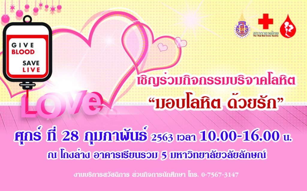 มหาวิทยาลัยวลัยลักษณ์ร่วมกับภาคบริการโลหิตแห่งชาติที่ 11 จังหวัดนครศรีธรรมราช ขอเชิญร่วมบริจาคโลหิต “มอบโลหิต ด้วยรัก” ในวันศุกร์ที่ 28 กุมภาพันธ์ พ.ศ. 2563 เวลา 10.00-16.00 น. ณ โถงล่างอาคารเรียนรวม 5 มหาวิทยาลัยวลัยลักษณ์