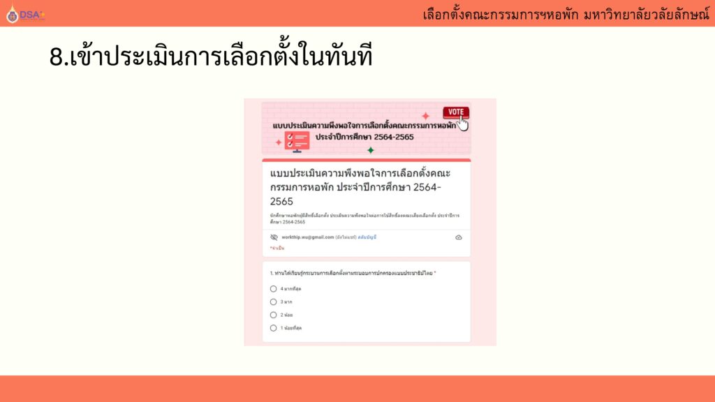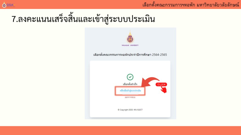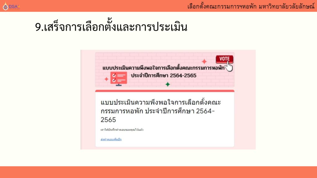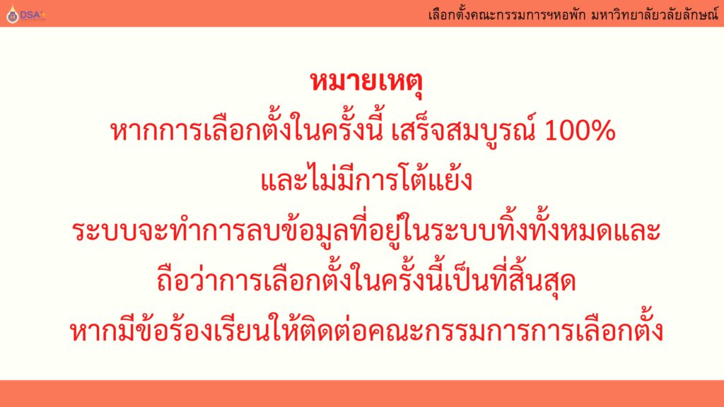 นักศึกษาจะได้รับบันทึกคะแนน 1 คะแนน เมื่อใช้สิทธิ์เลือกตั้งและประเมินกิจกรรมแล้วเท่านั้น!