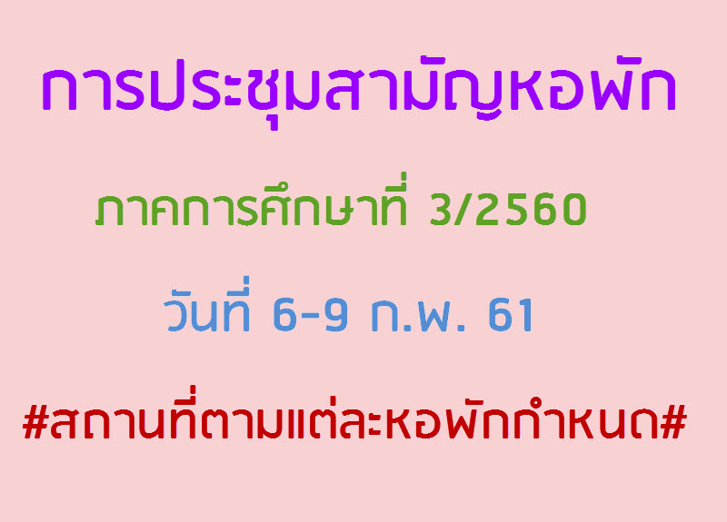 งานหอพัก ส่วนกิจการนักศึกษา กำหนดให้มีการประชุมสามัญหอพัก ประจำภาคการศึกษาที่ 3/2560