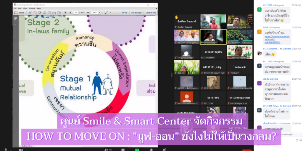 เมื่อวันที่ วันที่ 24 กุมภาพันธ์ 2565 เวลา 18.00-20.00 น. ศูนย์ Smile & Smart Center ส่วนกิจการนักศึกษา มหาวิทยาลัยวลัยลักษณ์ จัดกิจกรรม”สร้างสุข ปลุกรอยยิ้ม ประจำเดือนกุมภาพันธ์ ด้วยกิจกรรมที่ชื่อว่า HOW TO MOVE ON มูฟออนยังไงไม่ให้เป็นวงกลม?” ในรูปแบบออนไลน์ โดยมีนักศึกษาและผู้สนใจ เข้าร่วมกิจกรรมจำนวนกว่า 1,000 คน ผ่านโปรแกรม ZOOM Cloud Meetings