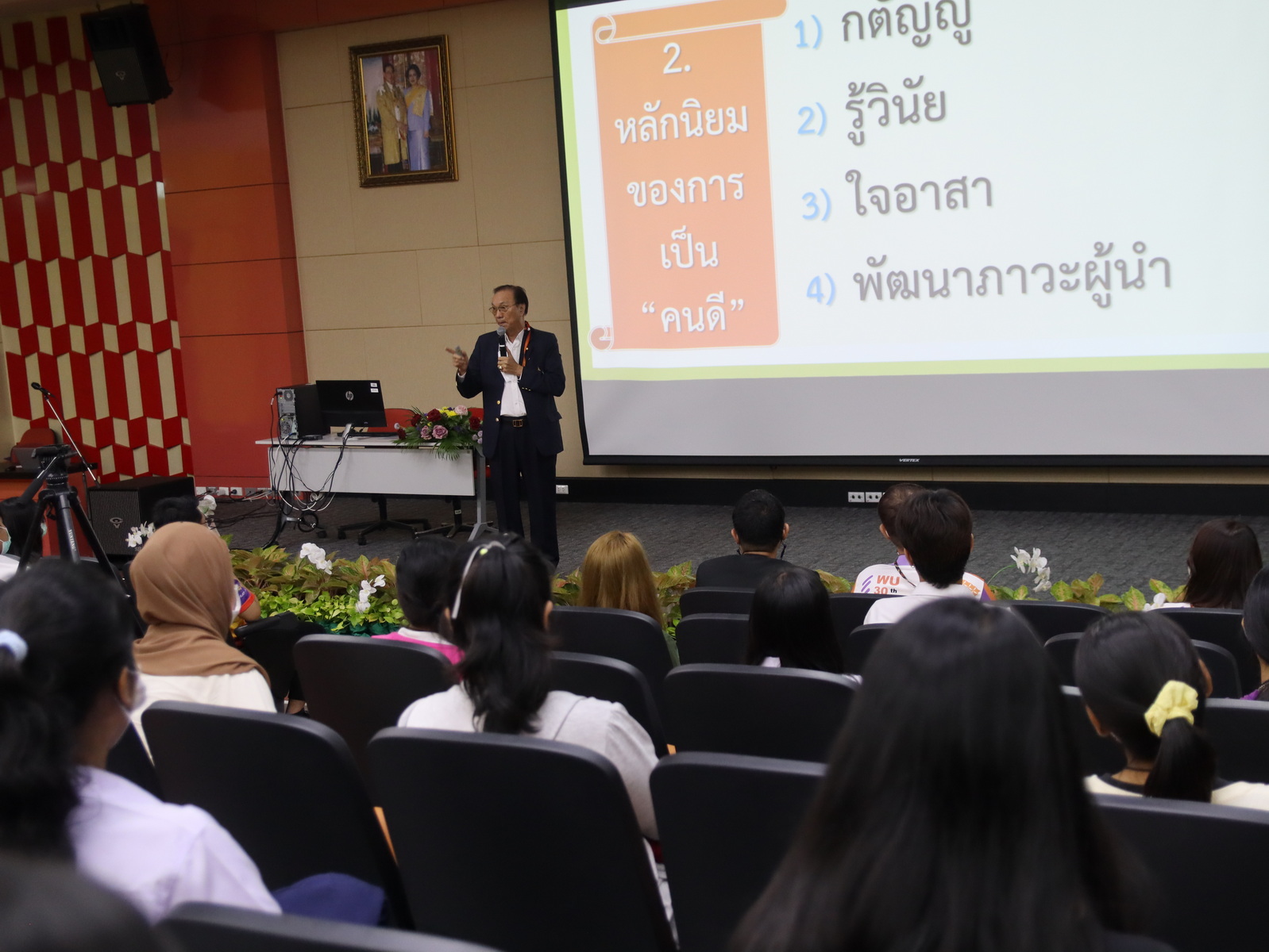 ในการนี้ได้รับเกียรติจาก ศาสตราจารย์ ดร.สมบัติ ธำรงธัญวงศ์ อธิการบดีบรรยายพิเศษ เรื่อง “ศิลปะการพูดให้ชนะใจสไตล์ผู้นำ” และอาจารย์ทัดดาว รักมาก ผู้ช่วยคณบดีฝ่ายกิจการนักศึกษา สำนักวิชาศิลปศาสตร์ บรรยายเรื่อง หลักการพูดและการสื่อสารอย่างสร้างสรรค์ การจัดกิจกรรมครั้งนี้เป็นไปตามแผนกิจกรรมพัฒนานักศึกษาตามแผนกลยุทธ์การเสริมสร้างนักศึกษาให้มีภาวะผู้นำ ณ ห้องประชุมศรีธรรมราช ชั้น 3 อาคารสถาปัตยกรรมและการออกแบบ มหาวิทยาลัยวลัยลักษณ์ โดยมีนักศึกษาที่เข้าร่วมกิจกรรมในครั้งนี้ประมาณ 350 คน ผลการประเมินความพึงพอใจนักศึกษามีความพึงพอใจในการร่วมร่วมกิจกรรมในระดับดีมากถึงมากที่สุดร้อยละ 93.5
