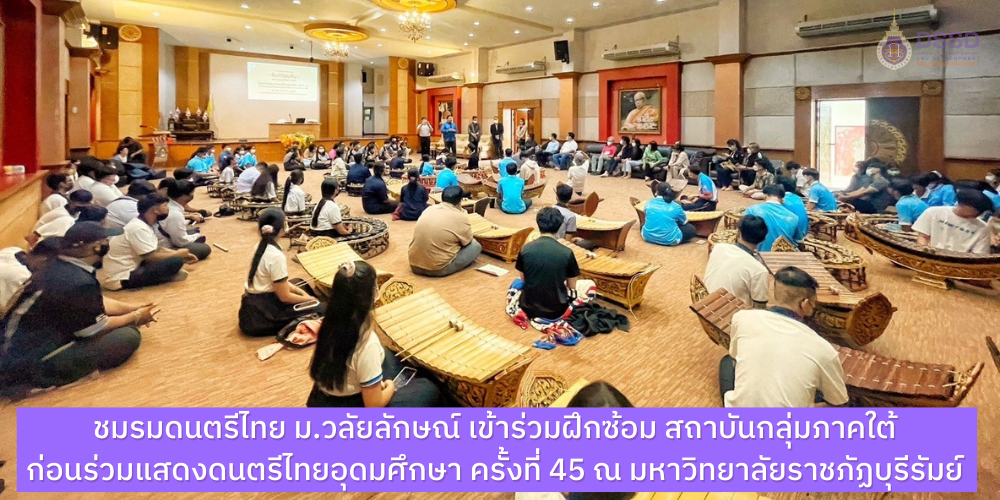 ชมรมดนตรีไทย มหาวิทยาลัยวลัยลักษณ์ เข้าร่วมฝึกซ้อม สถาบันกลุ่มภาคใต้ 12 สถาบัน ระหว่างวันที่ 10-12 ธันวาคม 2565 ณ มหาวิทยาลัยราชภัฏสุราษฏร์ธานี โดยมีนางกอบสุข อรชร รักษาการหัวหน้าส่วนส่งเสริมและพัฒนานักศึกษา และที่ปรึกษาชมรมนาฏศิลป์ นำนักศึกษาชมรมดนตรีไทยฝึกซ้อม