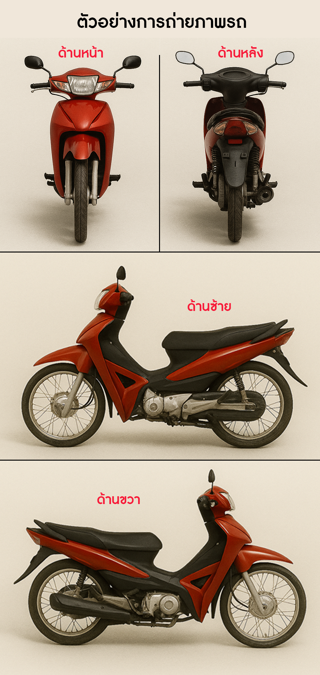 1.นักศึกษาเตรียมข้อมูลรถที่จะขึ้นทะเบียน ถ่ายภาพรถ 4 ด้าน (ด้านหน้า ด้านหลัง ด้านซ้าย ด้านขวา) ให้เห็นลักษณะรถชัดเจน ภาพตัวอย่าง