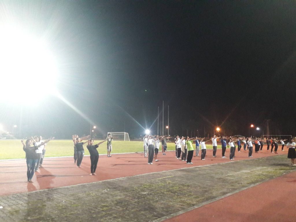 นักศึกษาผู้นำเชียร์ (Cheer Leader) ซ้อมนำเชียร์เพื่อเตรียมความพร้อมในพิธีเปิดการแข่งขันกีฬาสีภายใน มหาวิทยาลัยวลัยลักษณ์ ที่จะจัดขึ้นในวันที่ 16 กุมภาพันธ์ 2561