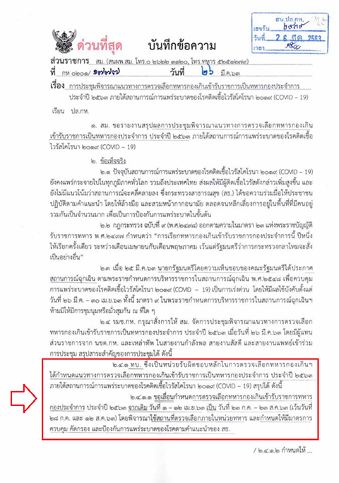 ตามที่ พลเอก ประยุทธ์ จันทร์โอชา นายกรัฐมนตรี และรัฐมนตรีว่าการกระทรวงกลาโหม ลงนามคำสั่งกระทรวงกลาโหม ที่ 357/2563 เรื่อง เลื่อนกำหนดการตรวจเลือกทหารกองเกิน เข้ารับราชการกองประจำการ ปี 2563 โดยระบุว่า ตามที่กองทัพบก ได้กำหนดให้มีการตรวจเลือกทหารกองเกิน เข้ารับราชการกองประจำการ ระหว่างวันที่ 1-12 เมษายนนั้น เนื่องจากปัจจุบันเกิดสถานการณ์การแพร่ระบาดของโรคติดต่อจากเชื้อไวรัสโควิด-19 ในประเทศไทย นายกรัฐมนตรี โดยความเห็นชอบของคณะรัฐมนตรี ได้ประกาศสถานการณ์ฉุกเฉินทั่วประเทศ ตาม พ.ร.ก.การบริหารราชการในสถานการณ์ฉุกเฉิน ซึ่งมีผลเมื่อวันที่ 26 มีนาคม – 30 เมษายน 2563
