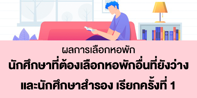 ตรวจสอบรายชื่อคลิก >>ผลการเลือกหอพัก นักศึกษาที่ต้องเลือกหอพักอื่นที่ยังว่าง และนักศึกษาสำรอง เรียกครั้งที่ 1