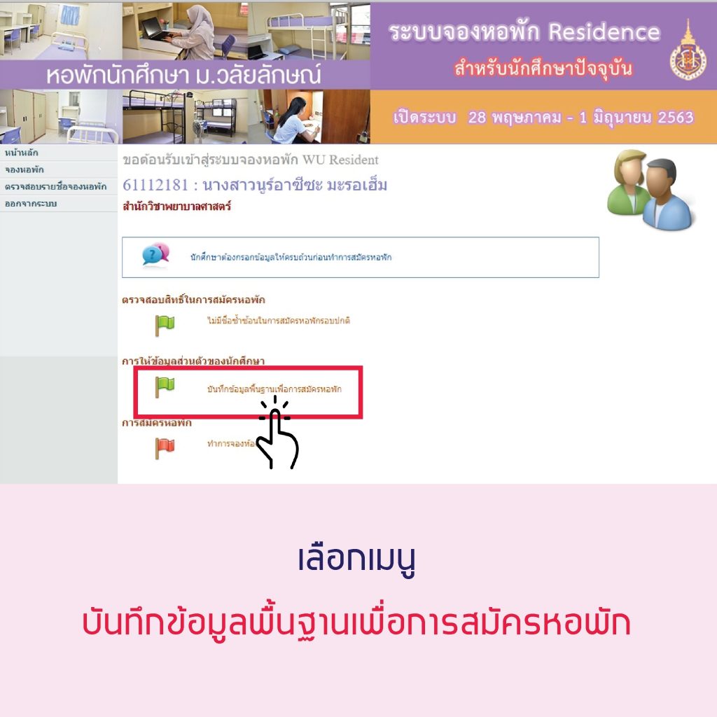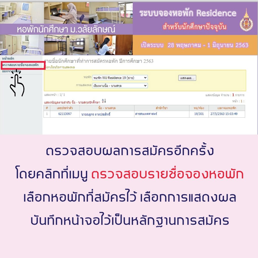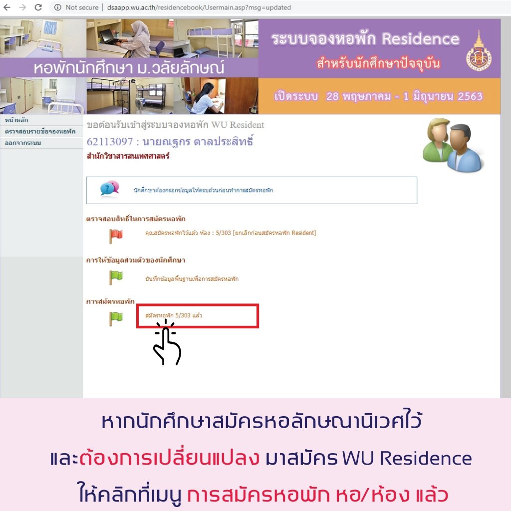5.[highlight color=”yellow”]เฉพาะนักศึกษาที่ได้สมัครหอพักลักษณานิเวศ ภาคเรียนที่ 1/2563 ไว้แล้ว[/highlight] และมีความประสงค์จะเปลี่ยนแปลงการสมัครหอพักเป็น WU Residence ให้ดำเนินการดังนี้