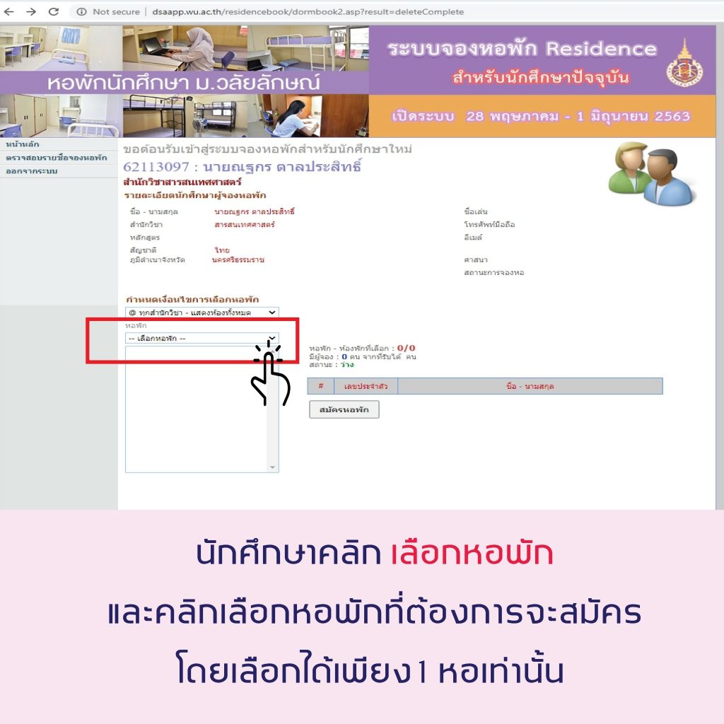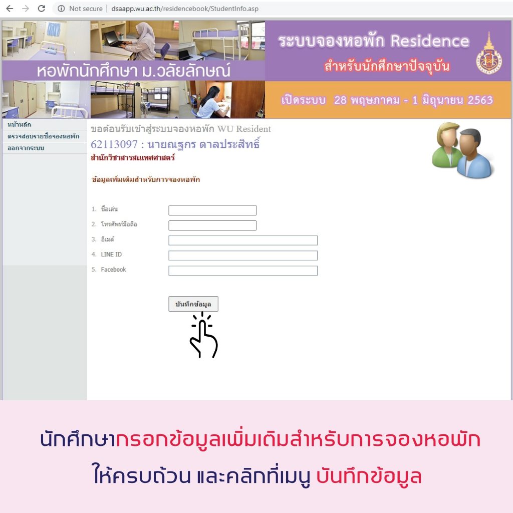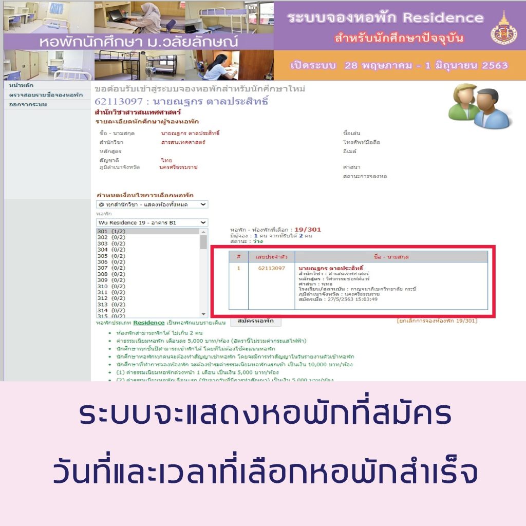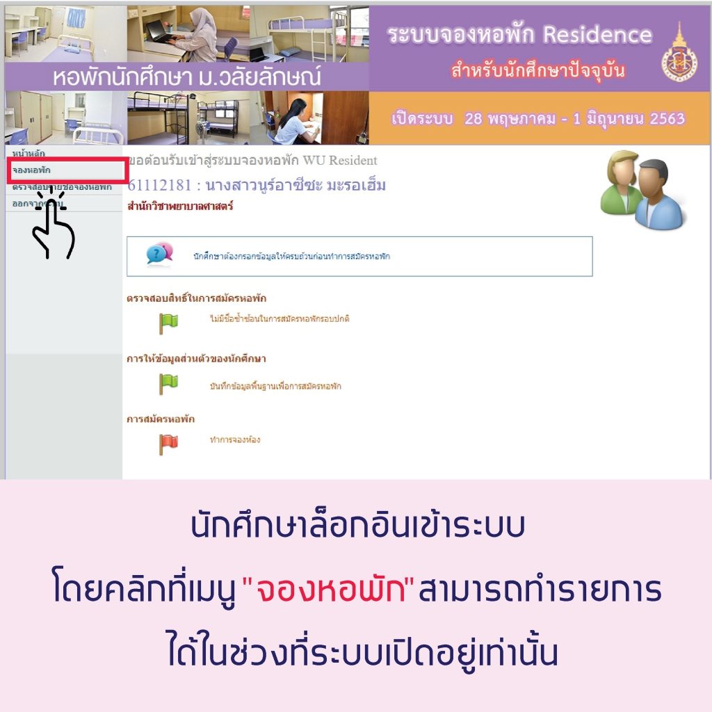 5.[highlight color=”yellow”]เฉพาะนักศึกษาที่ได้สมัครหอพักลักษณานิเวศ ภาคเรียนที่ 1/2563 ไว้แล้ว[/highlight] และมีความประสงค์จะเปลี่ยนแปลงการสมัครหอพักเป็น WU Residence ให้ดำเนินการดังนี้