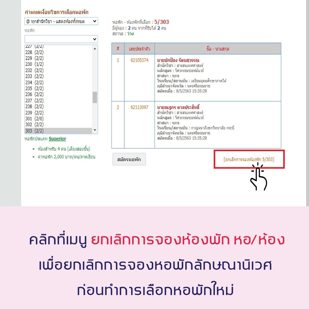 5.2 เลือกเมนู ยกเลิกการจองหอพัก หอ/ห้อง และดำเนินการต่อในขั้นตอนที่ 6