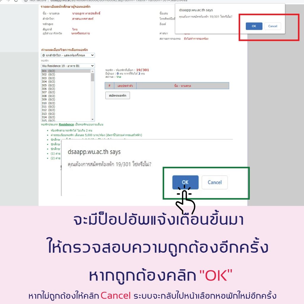7.เมื่อนักศึกษาคลิกเลือก ตรงกับ หอ/ห้อง ที่ต้องการแล้ว ให้กดเลือก สมัครหอพัก