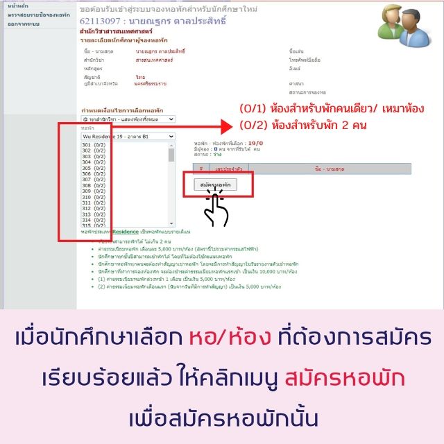 **หากนักศึกษามีความประสงค์จะพักคนเดียว ให้เลือกห้องพักที่มีหมายเหตุหลังเลขห้องเป็น (0/1) เท่านั้น หากประสงค์จะพักคนเดียว แต่ในระบบไม่มีห้องให้เลือก กรุณาติดต่อ 075-673185 (ในวันและเวลาทำการ)