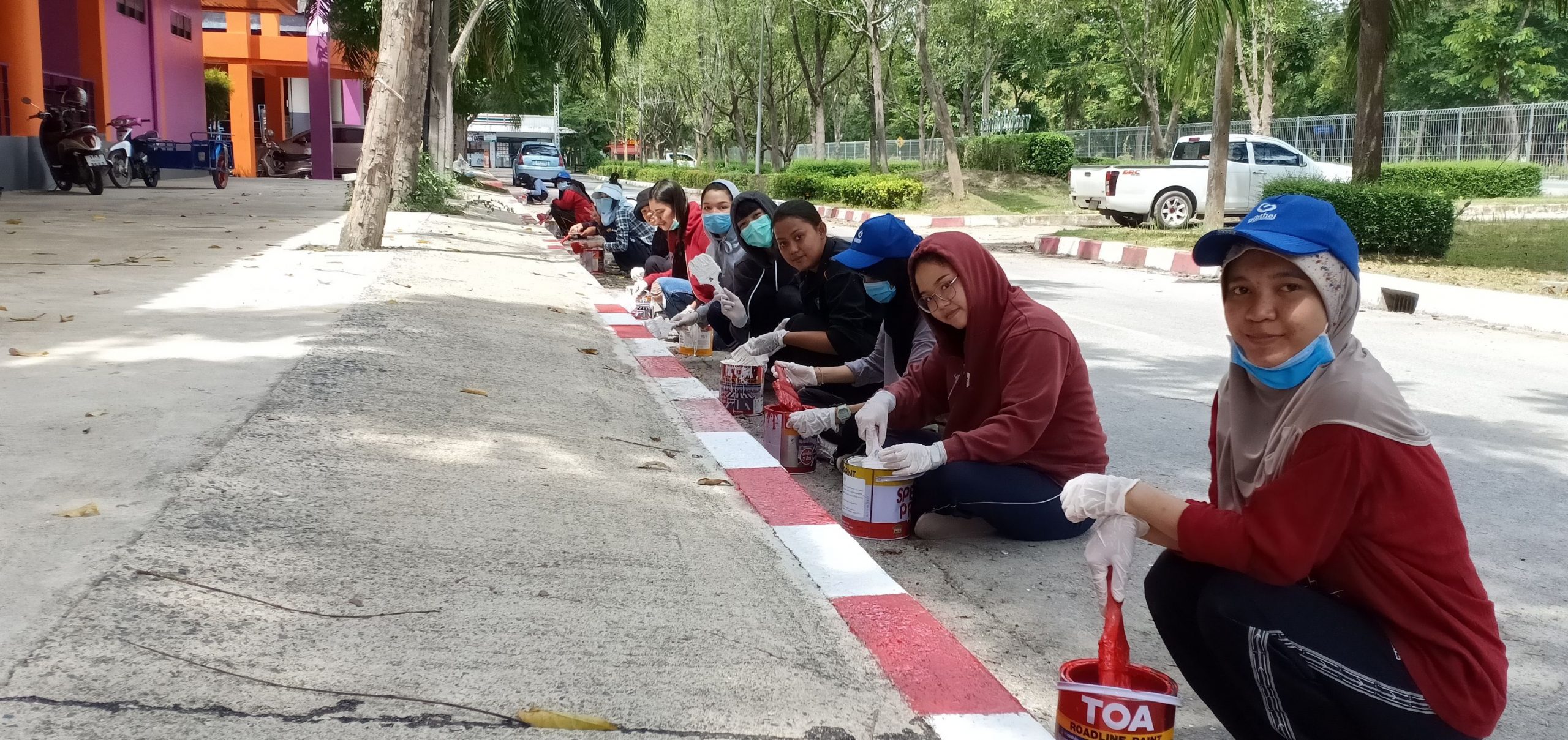 กิจกรรม “จิตอาสาทาสีจราจร” จัดขึ้นตั้งแต่วันที่ 24-26 มิถุนายน 2563 โดยภารกิจในแต่ละวัน ได้แก่ การทาสีฟุตบาทด้านซ้ายและขวาของการกิจกรรมนักศึกษา ถนนทางไปหอพัก ช่องจอดรถ และเนินลูกระนาด เป็นต้น เพื่อการใช้เส้นทางในวันรายงานตัวนักศึกษาใหม่เข้าหอพักผู้ปกครองที่เดินทางมาส่งบุตรหลานจะได้มีความสะดวกและปลอดภัย ในการนี้ขอชื่นชมนักศึกษาจิตอาสาทุกคนที่ตั้งใจปฏิบัติงานอย่างเต็มที่แม้แสงแดดจะร้อนมาก แต่นักศึกษาก็ไม่ย่อท้อยิ้มแย้มแจ่มใสมีความอดทนและเสียสละเป็นอย่างยิ่ง จึงขอขอบคุณมา ณ โอกาสนี้