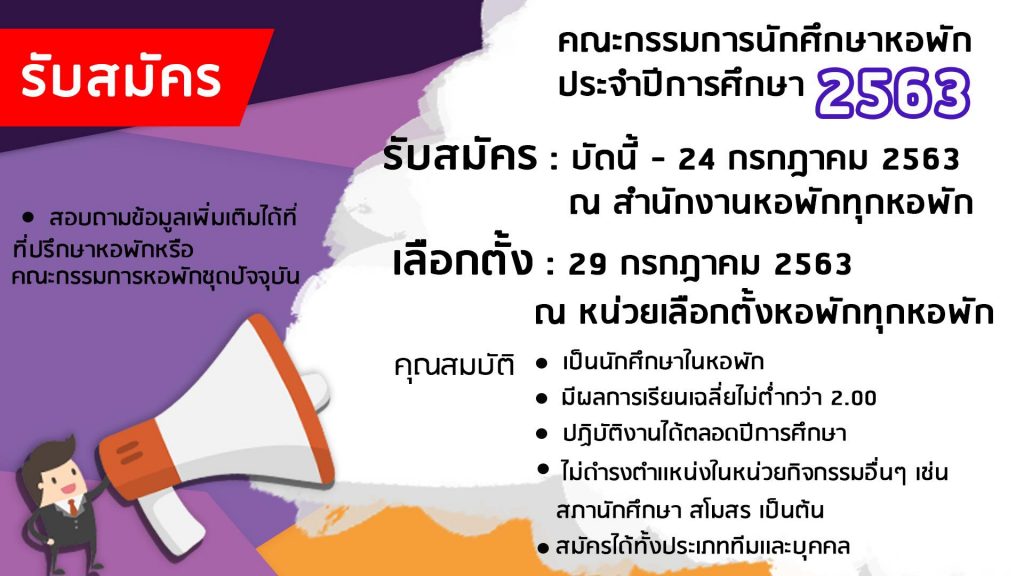ด้วยคณะกรรมการนักศึกษาประจำหอพัก ประจำปีการศึกษา 2562 ได้ดำรงตำแหน่งครบวาระแล้ว เพื่อให้การรับสมัครคณะกรรมการนักศึกษาหอพัก ประจําปีการศึกษา 2563 เป็นไปด้วยความเรียบร้อย งานหอพักนักศึกษาขอกําหนดรายละเอียดในการเลือกตั้งคณะกรรมการนักศึกษาหอพักปีการศึกษา 2563 ดังต่อไปนี้