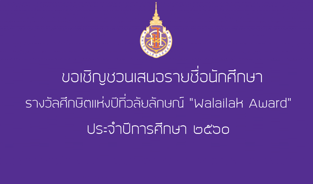 ในการนี้ จึงขอเชิญชวนคณาจารย์ บุคลากร และนักศึกษา เสนอชื่อนักศึกษาที่สมควรได้รับรางวัลศึกษิตแห่งปีที่วลัยลักษณ์ "Walailak Award" ประจำปีการศึกษา 2560 รายละเอียดตามไฟล์ใบเสนอชื่อที่แนบมากับข่าวนี้ โดยสามารถเสนอชื่อภายในวันที่ 31 กรกฎาคม 2561 ส่งมายัง งานส่งเสริมกิจกรรมนักศึกษา ส่วนกิจการนักศึกษา อาคารไทยบุรี