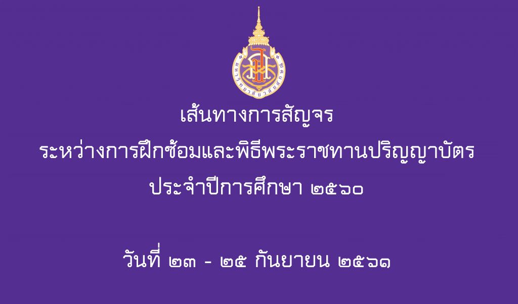 ตามที่มหาวิทยาลัยกำหนดพิธีพระราชทานปริญญาบัตร ประจำปีการศึกษา 2560 และการฝึกซ้อมบัณฑิต ตั้งแต่วันที่ 23 – 25 กันยายน 2561 นั้น เพื่อให้การสัญจรตามเส้นทางภายในมหาวิทยาลัยเป็นไปด้วยความเป็นระเบียบเรียบร้อย ฝ่ายอนุกรรมการฝ่ายอาคารสถานที่ ยานพาหนะ และรักษาความปลอดภัยและจราจรจึงกำหนดเส้นทางการจราจรระหว่างวันที่ 23-25 กันยายน 2561 ดังนี้