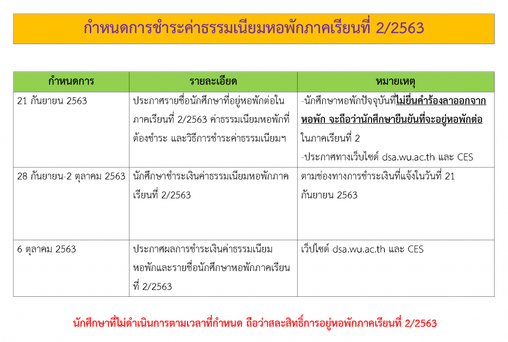 เพื่อให้สามารถรับสมัครนักสึกษาที่กลับบจากสหกิจศึกษาเข้ามาอยู่ในหอพักในภาคการศึกษาที่ 2/2563 ในที่พักที่ว่างได้ งานหอพักนักศึกษา กำหนดให้นักศึกษาหอพักปัจจุบัน ที่มีความประสงค์จะอยู่หอพักต่อในภาคเรียนที่ 2/2563 ดำเนินการชำระค่าธรรมเนียมหอพักเพื่อยืนยันสิทธิ์ในการอยู่หอพักของตนเอง โดยดำเนินการ ดังนี้