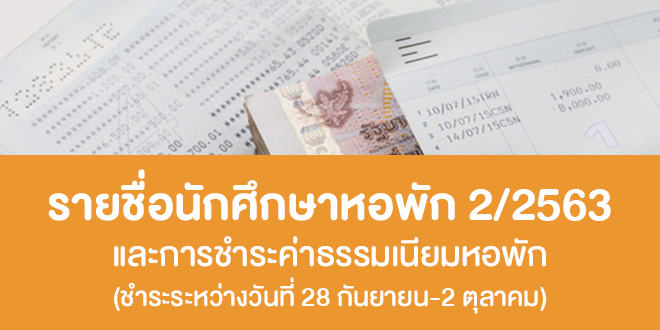 รายชื่อนักศึกษาหอพัก ภาคเรียนที่ 2/2563 และการชำระค่าธรรมเนียมหอพัก