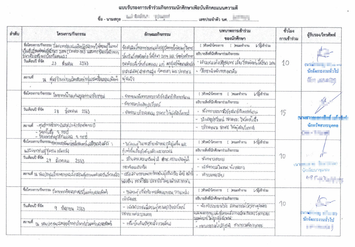 - บันทึกในแบบฟอร์ม ใบรับรองการขอคะแนนความดีระหว่างฝึกสหกิจศึกษา ระบุข้อมูล วันที่/เวลา สถานที่ทำกิจกรรม รายละเอียดของกิจกรรมที่ทำพอสังเขป และให้ผู้รับรองที่หน่วยงาน ลงนามรับรองพร้อม ชื่อ/หมายเลขโทรศัพท์